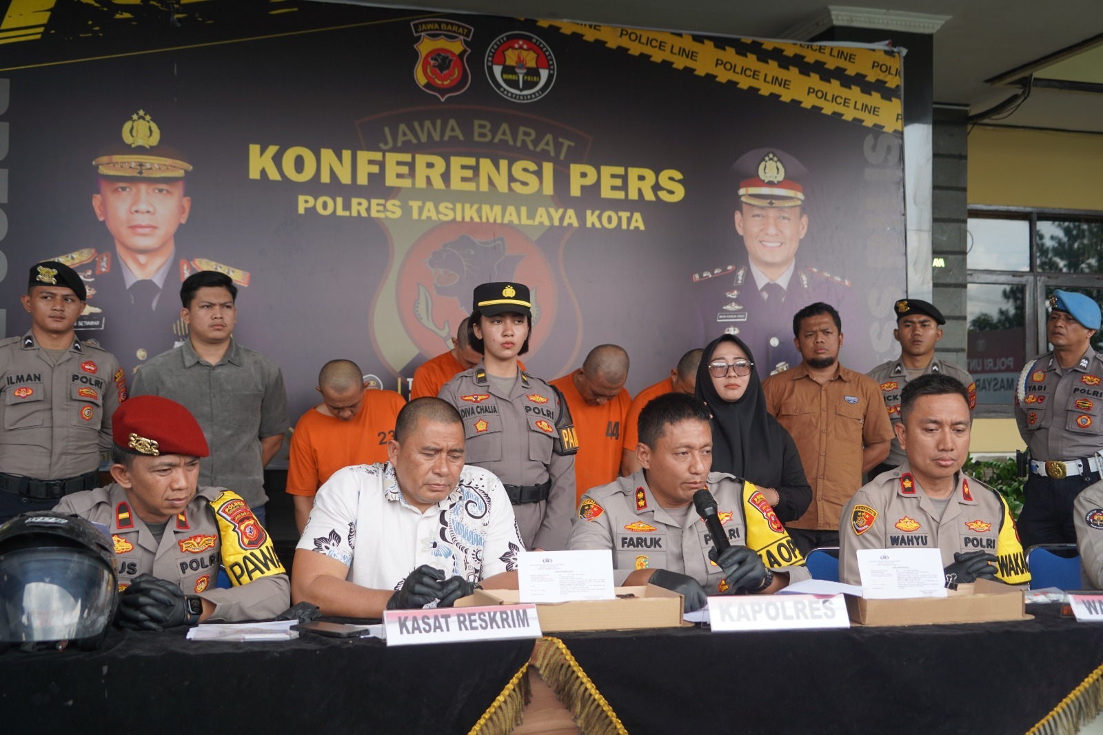 Setelah menerima laporan kejadian tersebut, Tim Sat Reskrim Polres Tasikmalaya Kota bergerak cepat melakukan penyelidikan dan pengejaran terhadap para pelaku. Dalam waktu kurang lebih lima jam sejak kejadian, petugas berhasil mengamankan keempat tersangka di salah satu hotel yang berada di wilayah Kota Tasikmalaya, berikut sejumlah barang bukti yang digunakan dalam aksi kejahatan tersebut.