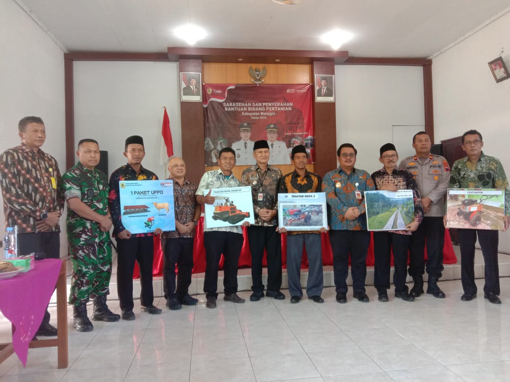 Penyerahan bantuan pertanian secara simbolis dilakukan oleh Bupati Wonogiri kepada perwakilan kelompok tani dari 12 kecamatan, meliputi alat dan mesin pertanian (alsintan) seperti hand tractor, cultivator, pompa air, serta pembangunan jalan usaha tani.