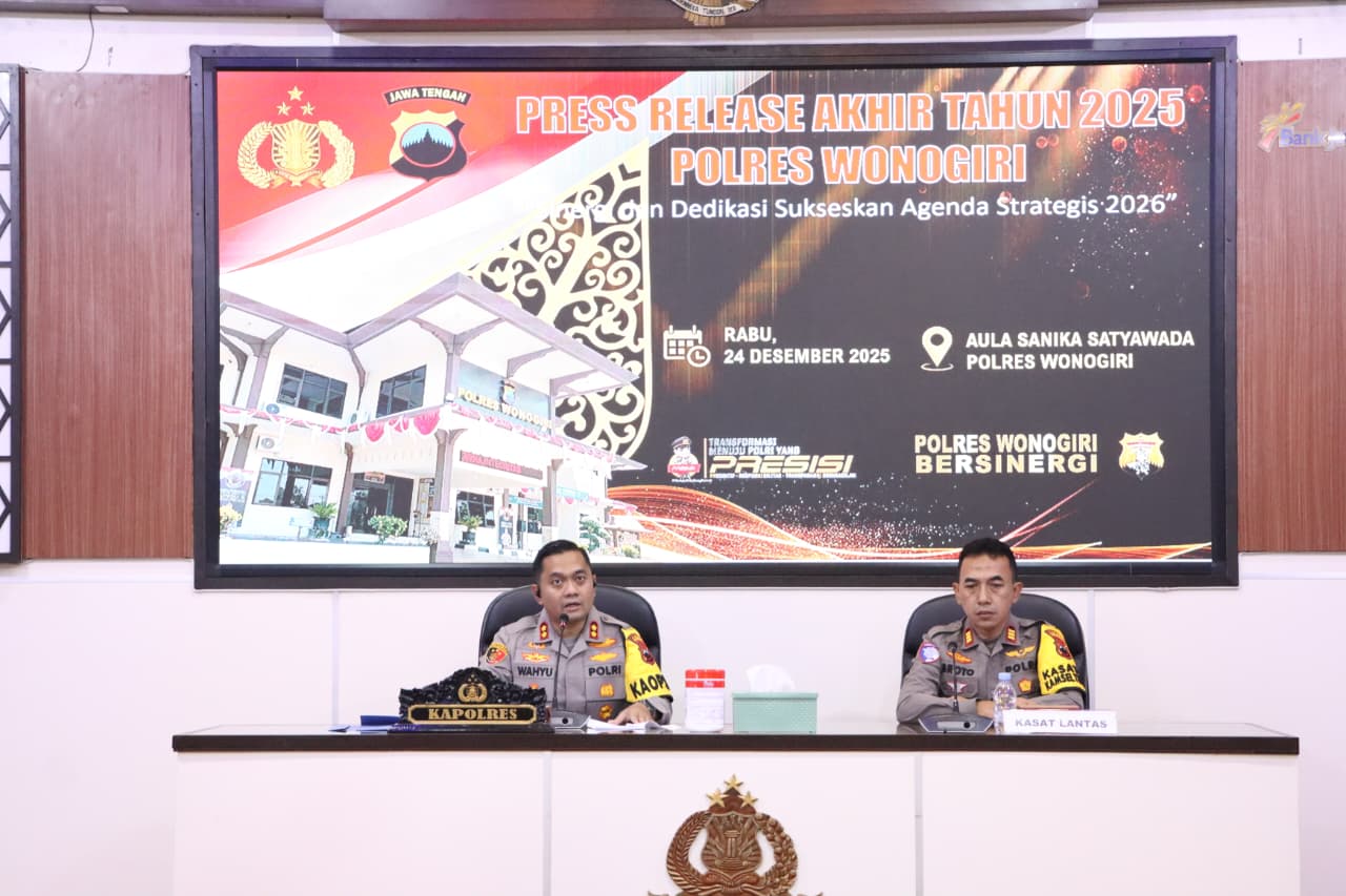 Wonogiri – Polres Wonogiri menggelar Press Release Akhir Tahun 2025 di Gedung Mapolres Wonogiri, Rabu (24/12/2025), sebagai bentuk transparansi dan akuntabilitas kinerja kepolisian kepada publik. Kegiatan tersebut memaparkan capaian Polres Wonogiri di bidang pemeliharaan keamanan dan ketertiban masyarakat (kamtibmas), penegakan hukum, keselamatan lalu lintas, serta pelayanan publik sepanjang tahun 2025.
