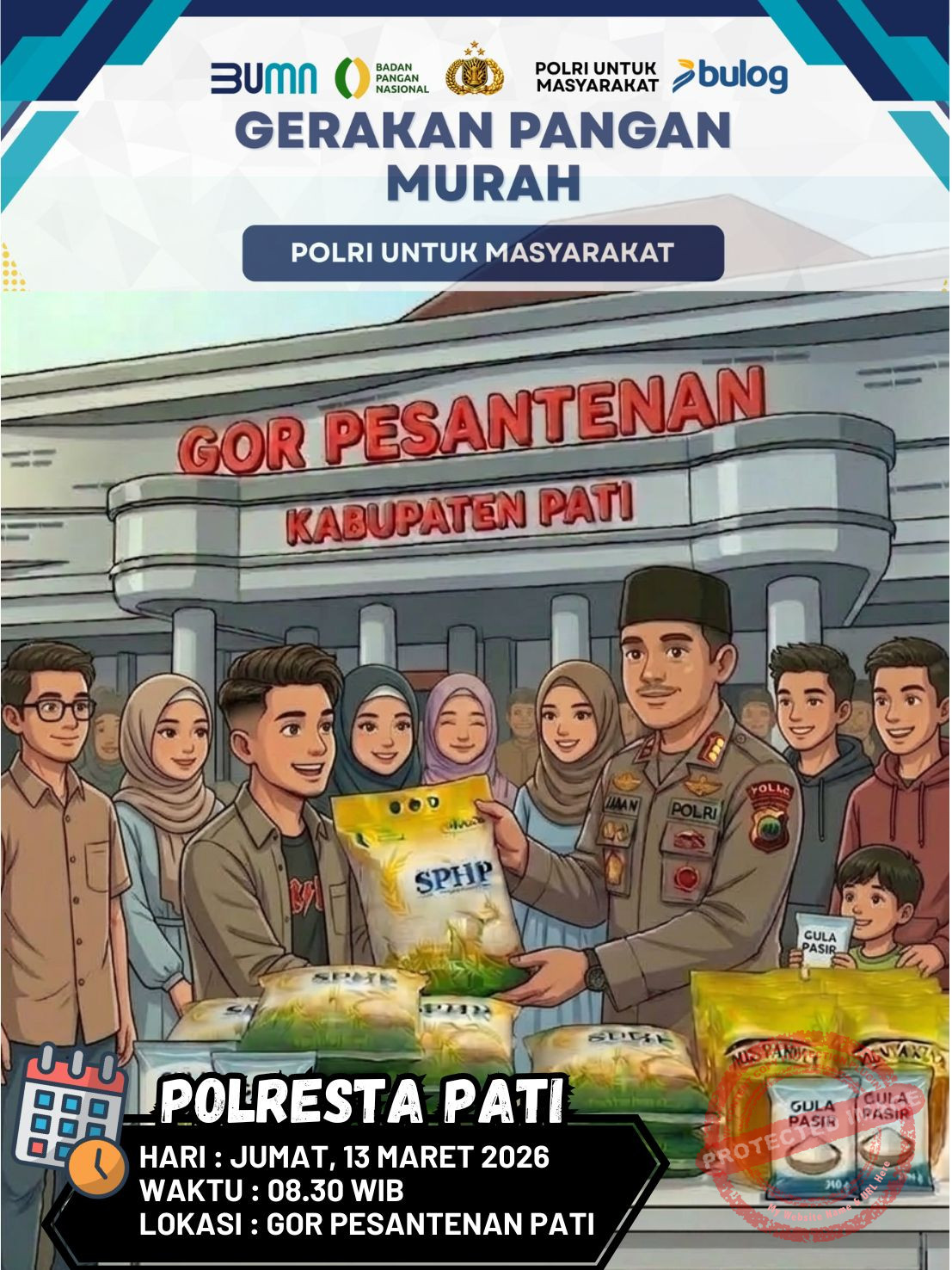 PATI – Polresta Pati melalui Satuan Pembinaan Masyarakat (Satbinmas) menggelar kegiatan Gerakan Pangan Murah (GPM) sebagai bentuk kepedulian terhadap masyarakat dalam memenuhi kebutuhan pokok dengan harga terjangkau. Kegiatan ini rencananya dilaksanakan di depan GOR Pesantenan Pati mulai pukul 08.30 WIB hingga selesai dan diperkirakan dihadiri sekitar 500 warga.