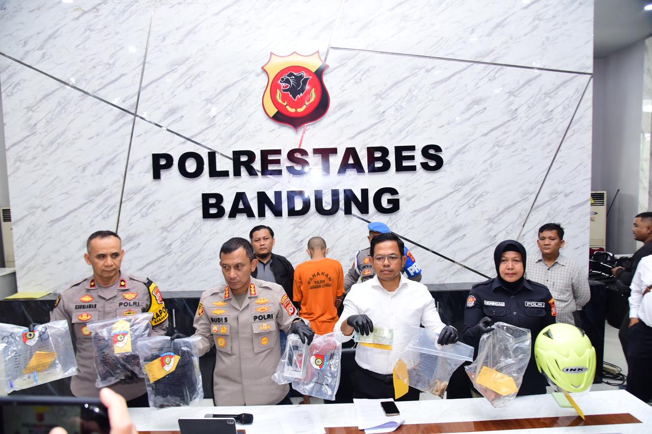 Kapolrestabes Bandung, Kombes Pol Dr. Budi Sartono, S.I.K., M.Si., M.Han., didampingi Kasat Reskrim Polrestabes Bandung AKBP Abdul Rahman, S.H., S.I.K., M.H., serta Kapolsek Babakan Ciparay Kompol Kurniawan, S.H., M.M., melaksanakan press release terkait pengungkapan kasus pencurian dengan kekerasan yang mengakibatkan korban meninggal dunia di wilayah Babakan Ciparay, Kota Bandung.