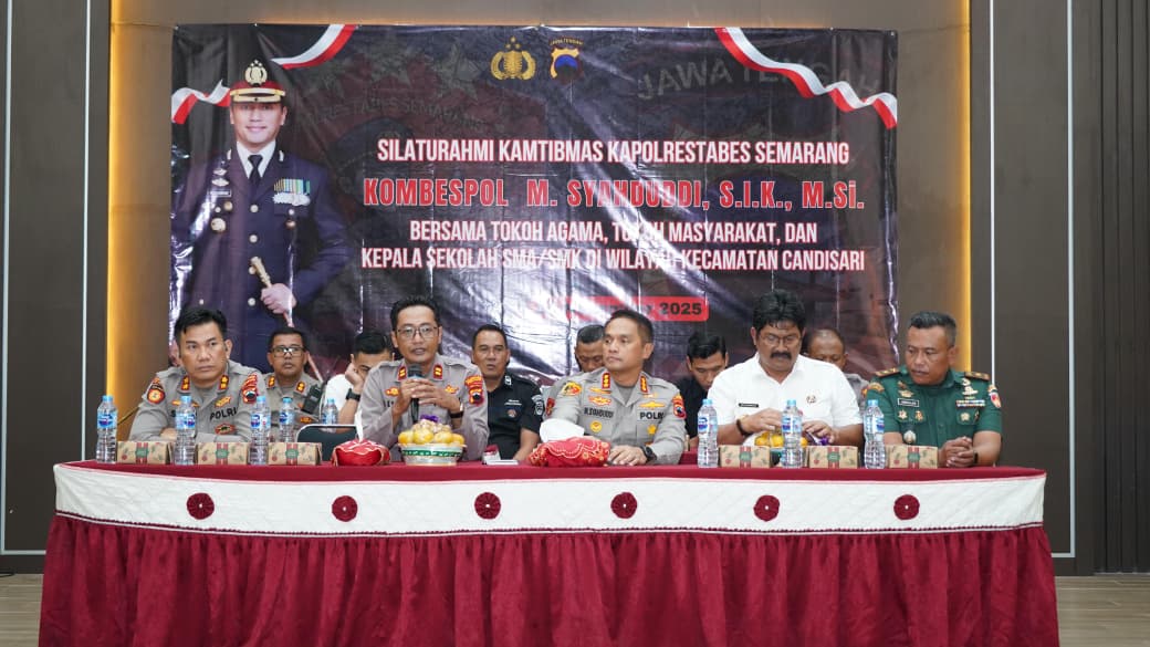 Semarang – Dalam rangka mempererat sinergi dan menjaga stabilitas keamanan di wilayah hukum Kota Semarang, Kapolrestabes Semarang Kombes Pol M. Syahduddi, S.I.K., S.H., M.Si. melaksanakan kegiatan Silaturahmi Kamtibmas bersama tokoh agama (toga), tokoh masyarakat (tomas), serta para kepala sekolah SMA/SMK se-Kecamatan Candisari. Kegiatan berlangsung di Balai Kecamatan Candisari pada Rabu (12/11/2025) sore, dihadiri sekitar 80 peserta dari berbagai unsur Forkopimcam.