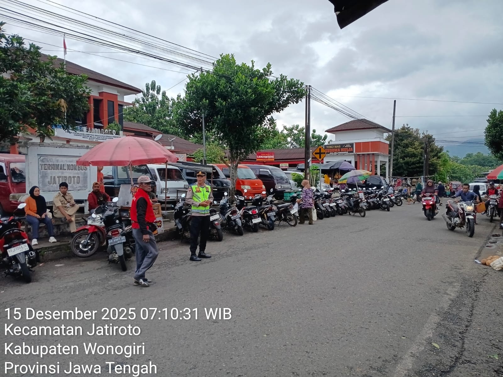 Wonogiri – Polsek Jatiroto, Polres Wonogiri, melaksanakan pengamanan (pam) kegiatan Pasaran Legi di Terminal Non Bus Jatiroto, Senin (15/12/2025) pagi. Pengamanan dimulai pukul 07.00 WIB hingga selesai guna memastikan kelancaran aktivitas masyarakat dan situasi keamanan tetap kondusif.