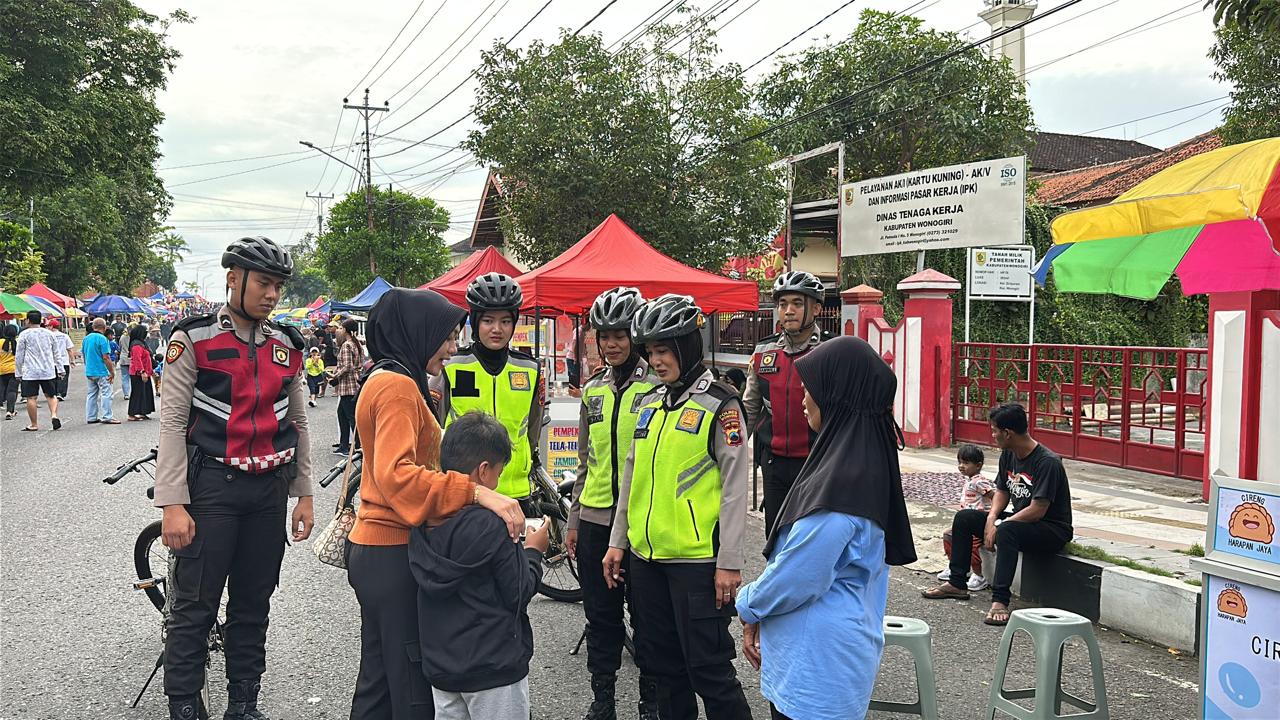 Wonogiri – Polwan Polres Wonogiri menggelar patroli bersepeda saat hari bebas kendaraan (car free day/CFD) di sekitar alun-alun Giri Krida Bakti Wonogiri, Minggu (2/2/2025).
