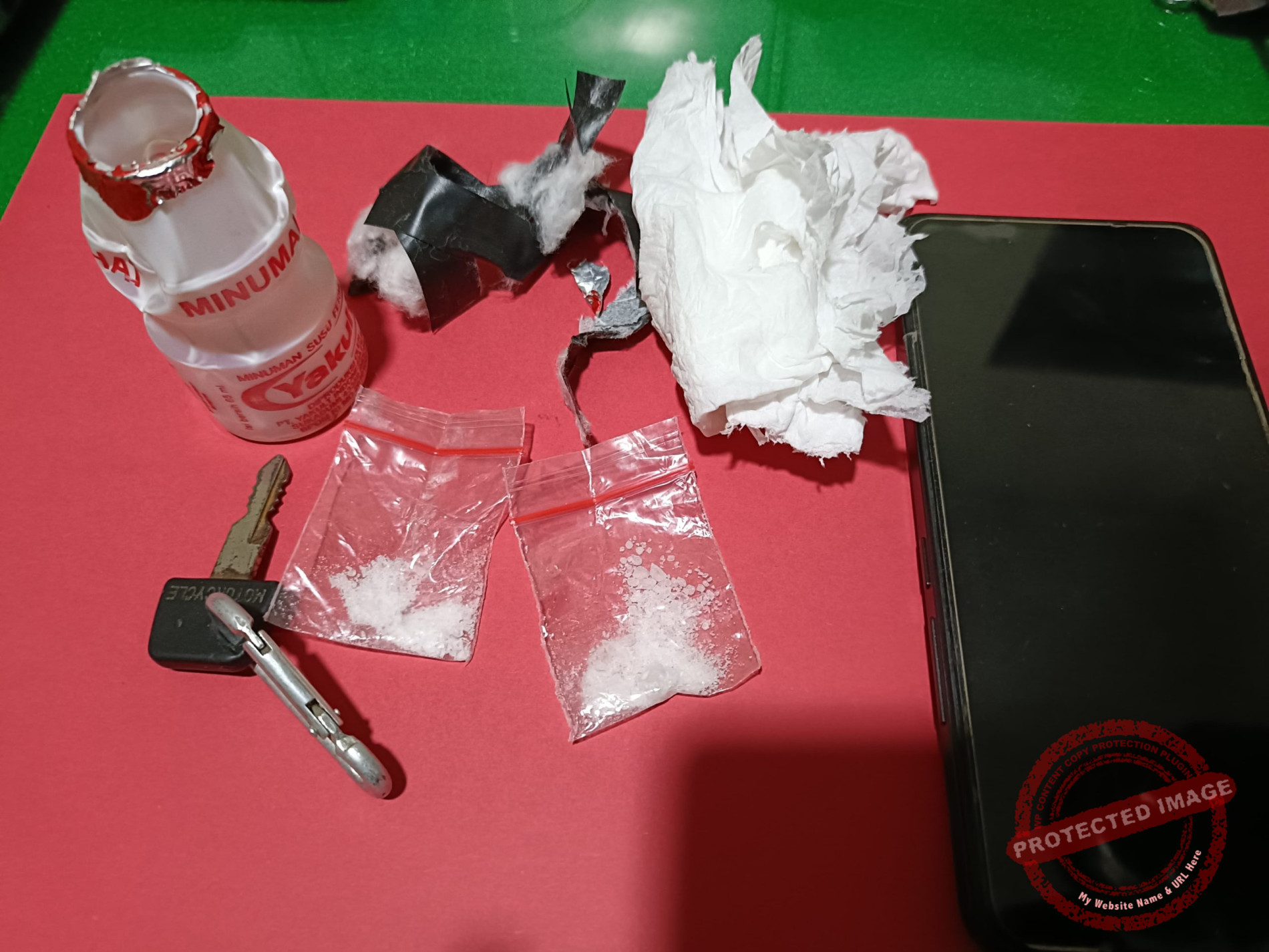 Saat dilakukan penggeledahan, polisi menemukan dua plastik klip berisi sabu dengan berat bruto 1,8 gram. Barang haram itu dibungkus kapas dan dililit plester warna hitam di dalam botol minuman probiotik.