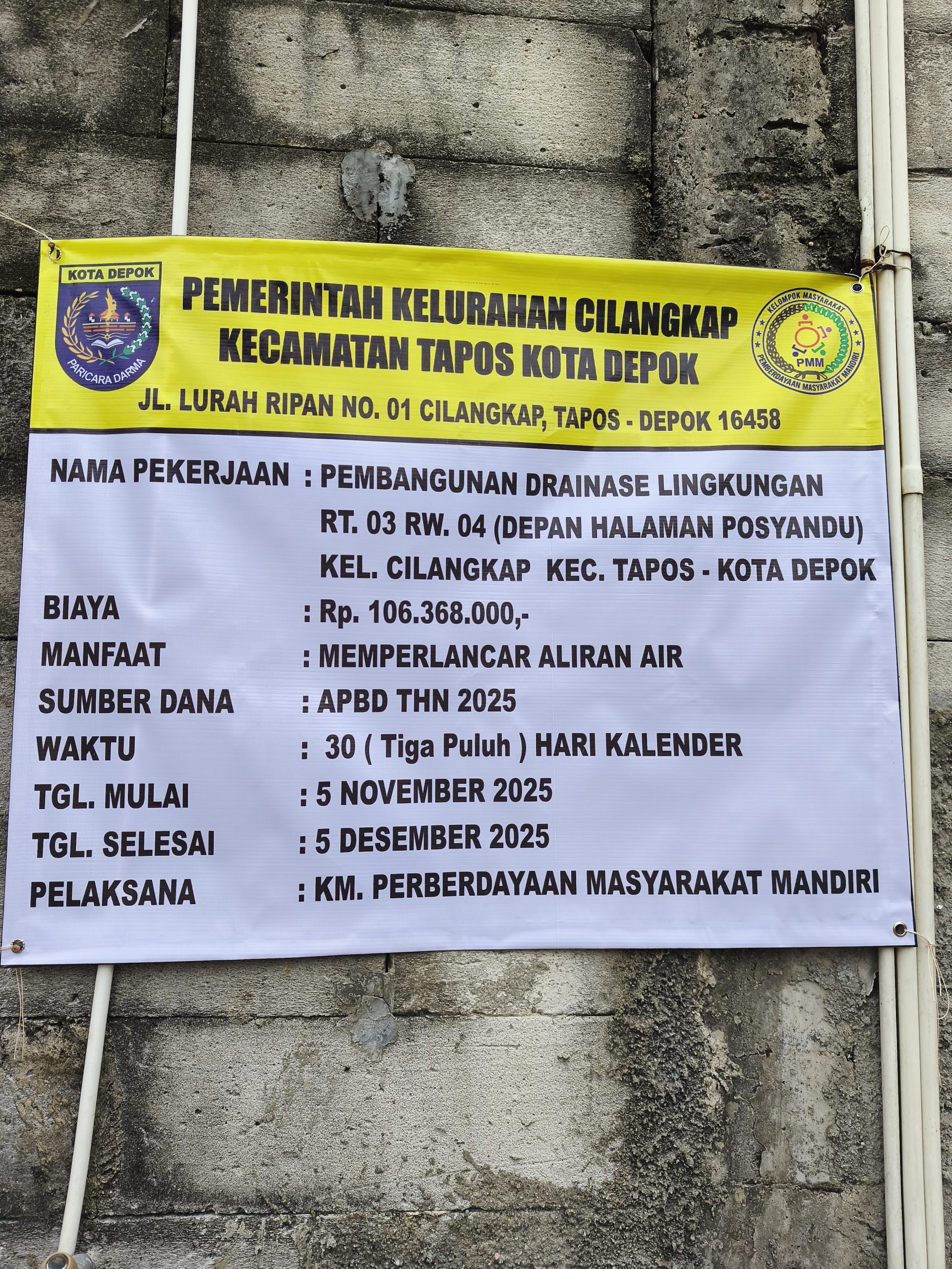 Depok_HARIANESIA.COM_17 november 2025, Dugaan kejanggalan kembali mencuat dalam pelaksanaan proyek drainase lingkungan di kelurahan cilangkap, kecamatan tapos, kota depok. Proyek bernilai rp106.368.000 yang dikerjakan melalui program pemberdayaan masyarakat mandiri ini dinilai asal dikerjakan dan minim pengawasan.