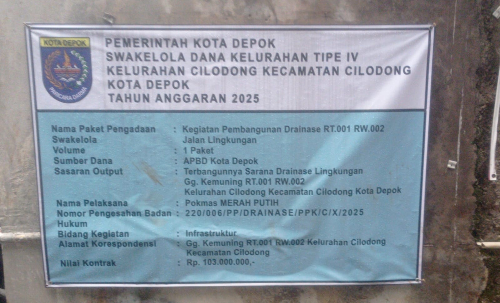 Depok_Dugaan kejanggalan kembali mengemuka dalam pelaksanaan proyek drainase lingkungan di Kelurahan Cilodong, Kecamatan Cilodong, Kota Depok.