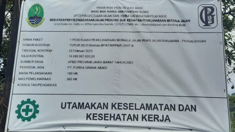 Bandung_HARIANESIA.COM_Sangat disayangkan, kegiatan pekerjaan pemeliharaan berkala jalan pada Ruas Jalan Banjaran – Pangalengan yang saat ini tengah berlangsung berdasarkan Paket Kontrak No. 75/PUPR.08.01/BM.6.4.2.2/PPK/PJJ/UPT-III/2025 tanggal 25 Februari 2025 dengan nilai kontrak sebesar Rp 14.493.967.620,00 dan pelaksana PT. Purna Graha Abadi dinilai amburadul atau tidak sesuai spek.