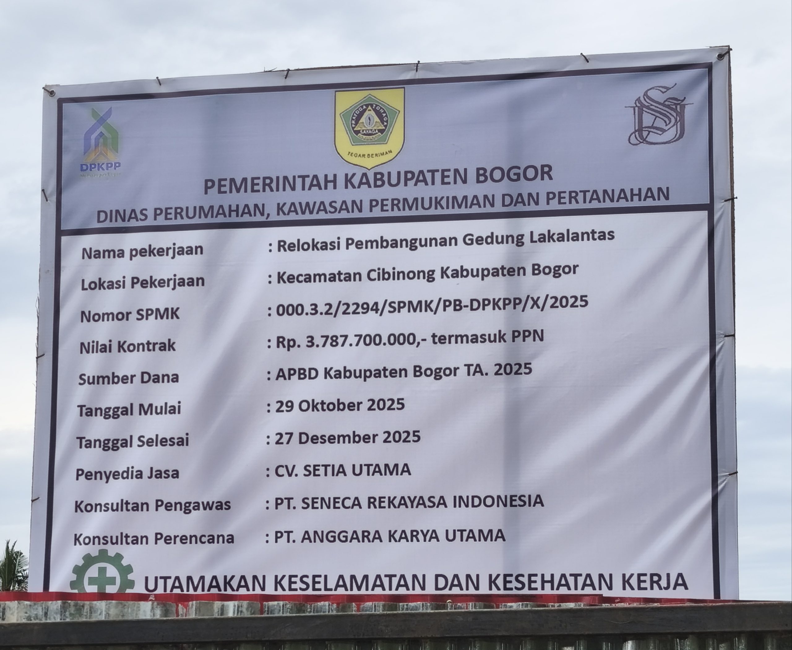 Bogor_HARIANESIA.COM_ 10 November 2025_Proyek Relokasi Pembangunan Gedung Laka Lantas yang sedang dikerjakan di Kecamatan Cibinong, Kabupaten Bogor, kembali menjadi sorotan setelah muncul laporan adanya larangan liputan terhadap wartawan di lapangan. Proyek yang dibiayai APBD Kabupaten Bogor Tahun Anggaran 2025 tersebut memiliki nilai kontrak sebesar Rp3.787.700.000, dengan penyedia jasa CV Setia Utama, serta konsultan pengawas PT Seneca Rekayasa Indonesia dan konsultan perencana PT Anggara Karya Utama.