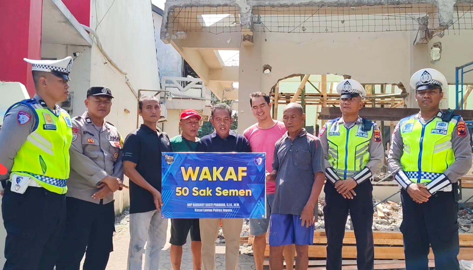 Bantuan semen tersebut diserahkan langsung oleh perwakilan dari Satlantas Polres Jepara kepada pengurus Masjid Jami’ Al-Muqorrobin. Pengurus masjid menyambut baik bantuan ini dan mengucapkan terima kasih kepada Polres Jepara atas kepeduliannya.