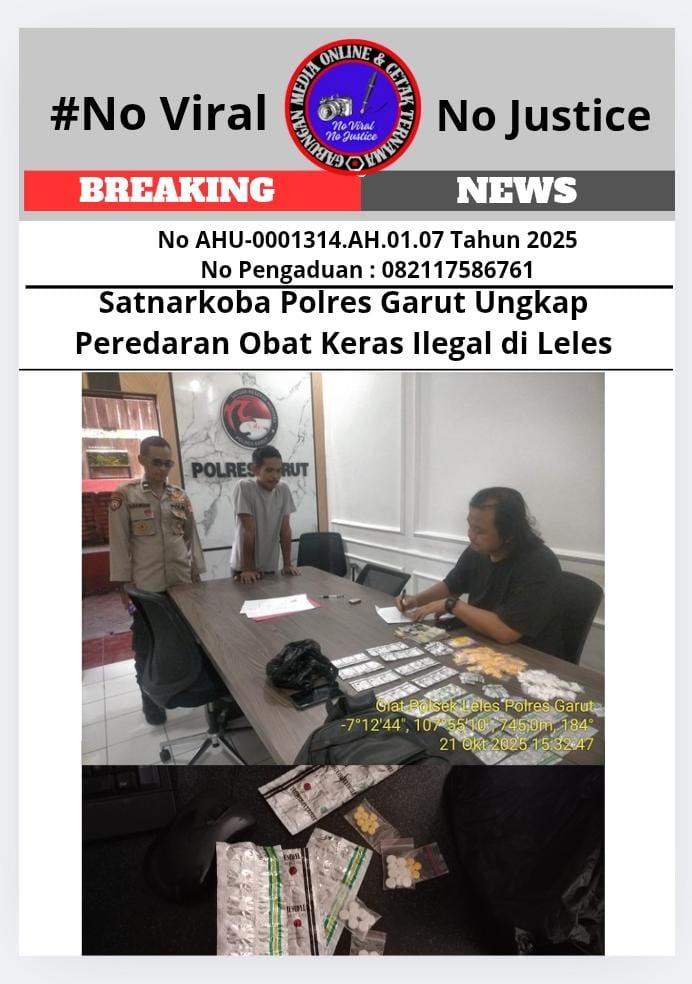 Garut_HARIANESIA.COM_22 Oktober 2025 (GMOCT) – Tim Satuan Narkoba (Satnarkoba) Polres Garut berhasil mengungkap kasus peredaran obat keras daftar G tanpa izin resmi di wilayah Kecamatan Leles, Kabupaten Garut. Penangkapan dilakukan pada hari Selasa, 21 Oktober 2025, sekitar pukul 15.10 WIB di sebuah warung kontainer yang berlokasi di Jl. Raya Leles No.13, Leles.