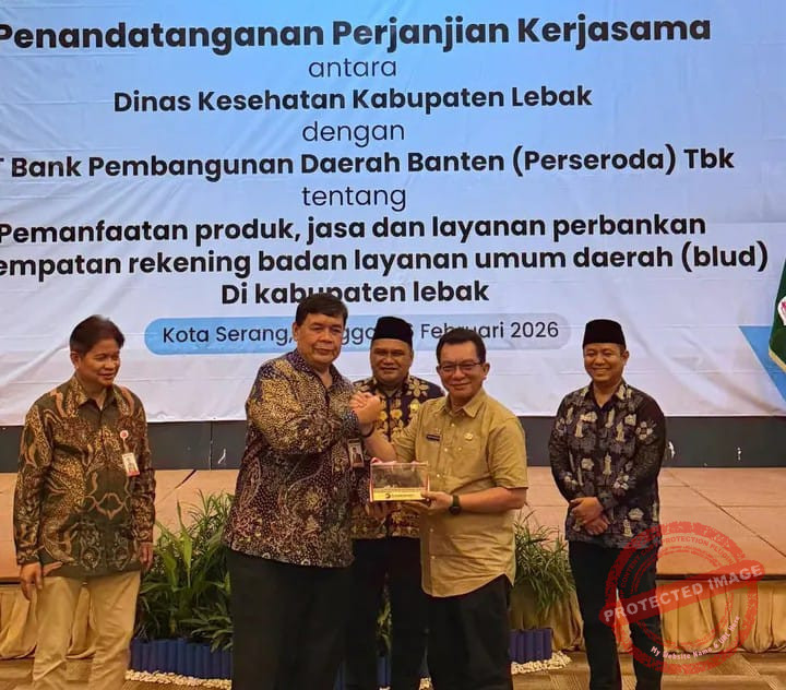Penandatanganan kerja sama tersebut terkait pemanfaatan produk, jasa, dan layanan perbankan dalam penempatan rekening Badan Layanan Umum Daerah (BLUD) di lingkungan Dinas Kesehatan Kabupaten Lebak. Kegiatan berlangsung di Ballroom Hotel Horison, Kota Serang, pada Jumat (06/02/2026).