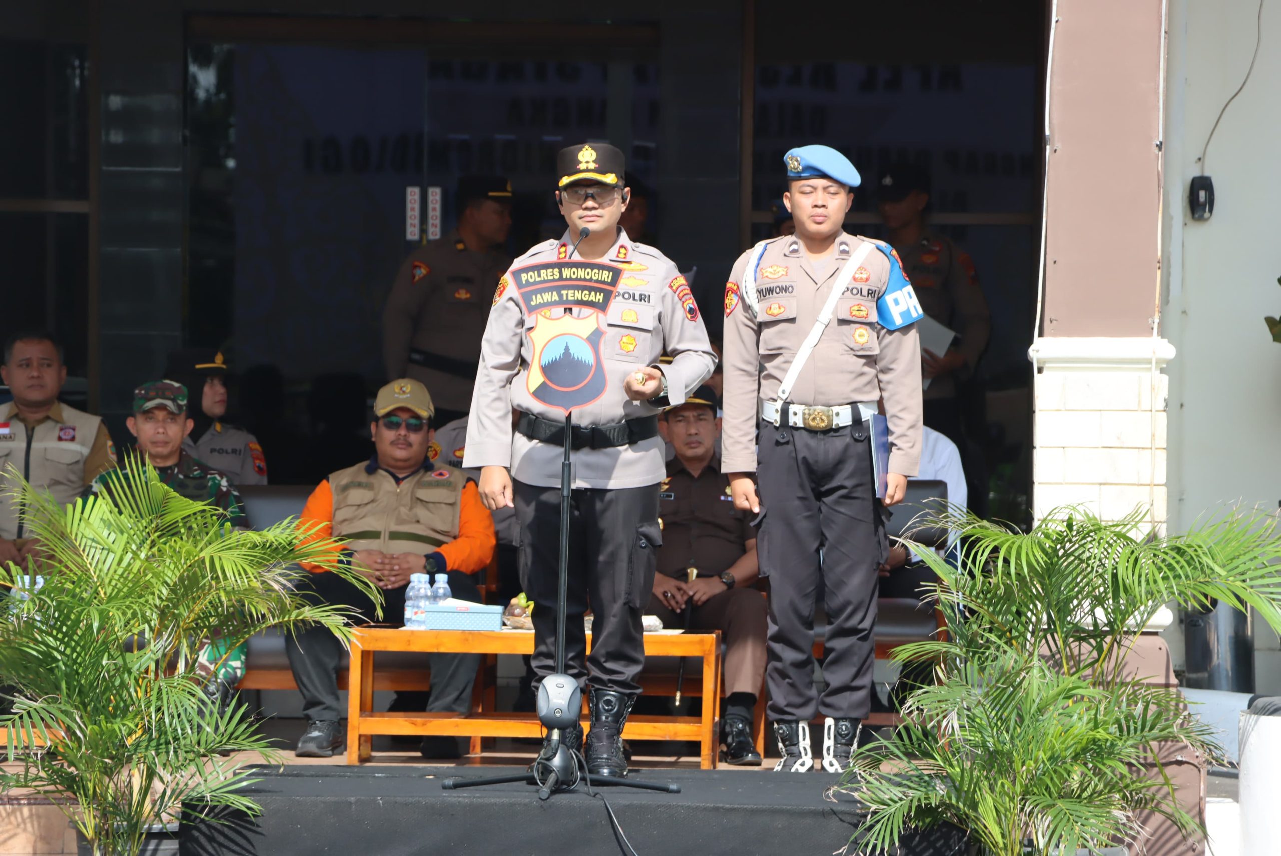 Apel dipimpin langsung oleh Kapolres Wonogiri AKBP Wahyu Sulistyo, S.H., S.I.K., M.P.M., dan dihadiri jajaran Forkopimda Wonogiri mulai dari Dandim 0728/Wonogiri Letkol Inf Edi Ristriyono, Wakil Bupati Imron Rizkyarno, hingga Kepala BPBD Fuad Wahyu Pratama.