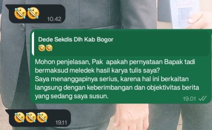 Sebelumnya, berbagai media telah memberitakan dugaan bahwa pajak mobil dinas DLH Kabupaten Bogor menunggak selama bertahun-tahun. Dalam klarifikasi yang dikirim melalui pesan WhatsApp, jurnalis harianesia.com menanyakan maksud di balik respons sang pejabat yang menggunakan emoji tawa berulang kali. Namun, alih-alih memberi klarifikasi resmi, Dede Armansyah kembali membalas dengan emoji yang sama.