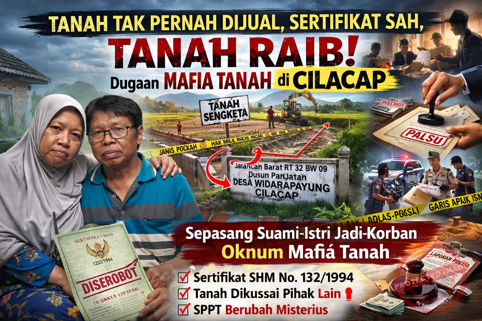 Perkara ini terungkap saat ia hendak menebus sertifikat yang sebelumnya dijadikan jaminan kredit di salah satu bank di Cilacap pada 2018. Dalam proses pengecekan administrasi, ditemukan kejanggalan: data pajak bumi dan bangunan (SPPT) disebut telah berubah atas nama orang lain, sementara penguasaan fisik tanah pun bukan lagi berada di tangannya.