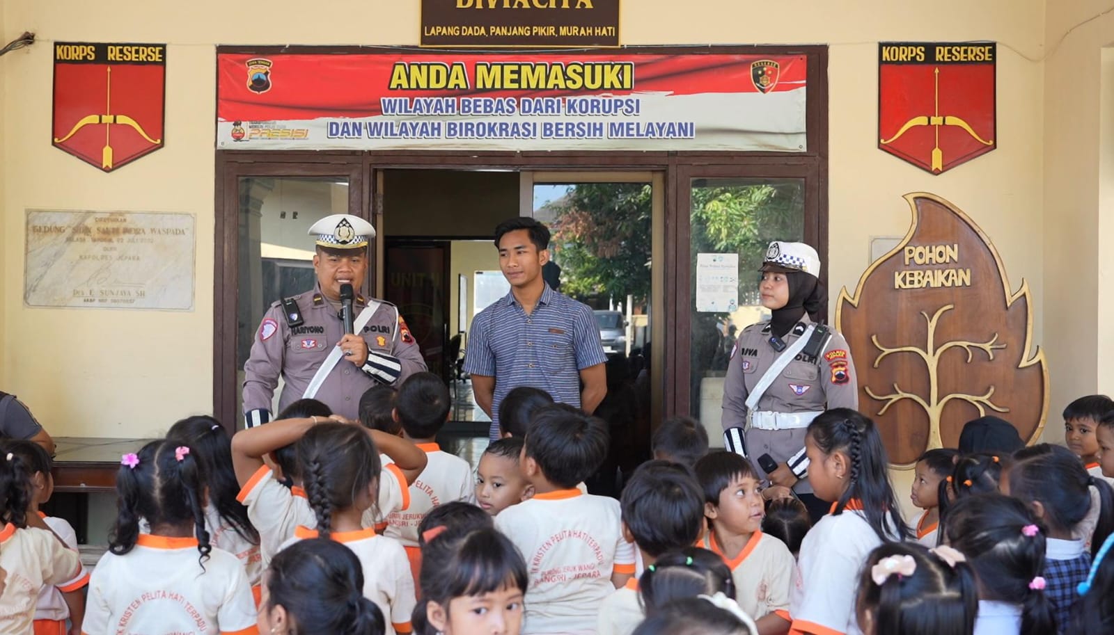 Jepara_HARIANESIA.COM_Polres Jepara | Kepolisian Resor (Polres) Jepara, Polda Jawa Tengah, melalui Satuan Lalu Lintas (Satlantas) menggelar kegiatan sosialisasi kepada anak-anak TK Ester Bangsri dan TK Pelita Hari Jerukwangi di Mapolres Jepara, Rabu (8/10/2025).