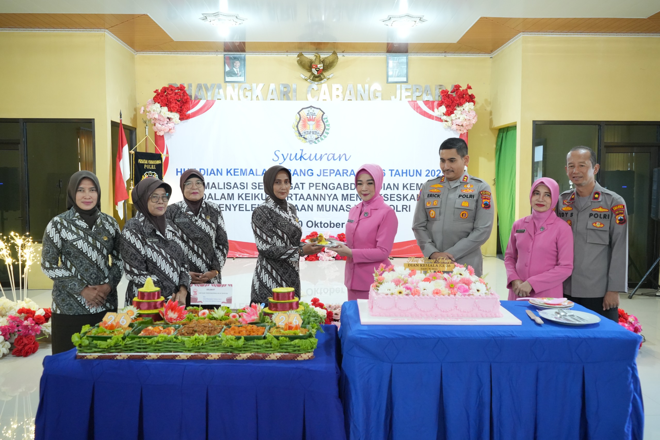 Acara kemudian dilanjutkan dengan penyerahan tali asih secara simbolis, pemotongan tumpeng oleh Ketua Bhayangkari Cabang Jepara yang diserahkan kepada Ketua Dian Kemala Cabang Jepara, doa bersama, serta ramah tamah. Seluruh rangkaian kegiatan berlangsung aman, lancar, dan penuh kekeluargaan.