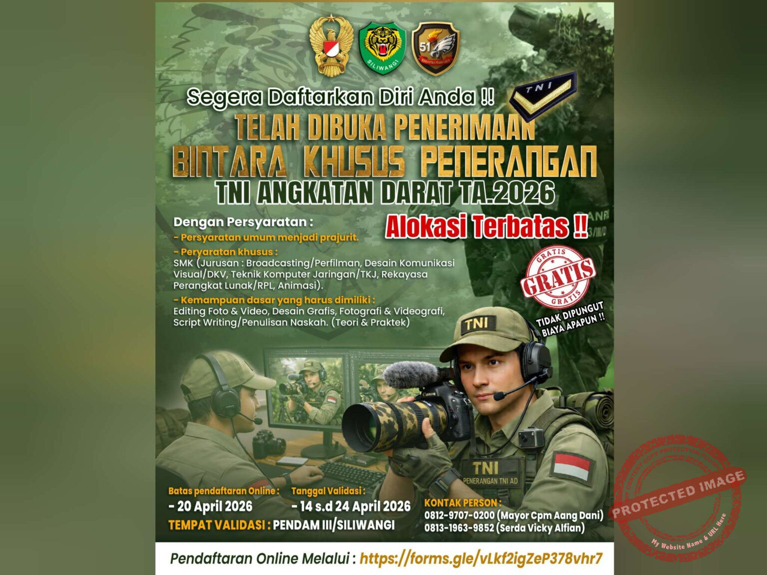 Adapun batas pendaftaran online ditetapkan hingga 20 April 2026. Sementara itu, proses validasi administrasi dijadwalkan berlangsung pada 14 hingga 24 April 2026 di Pendam III/Siliwangi.