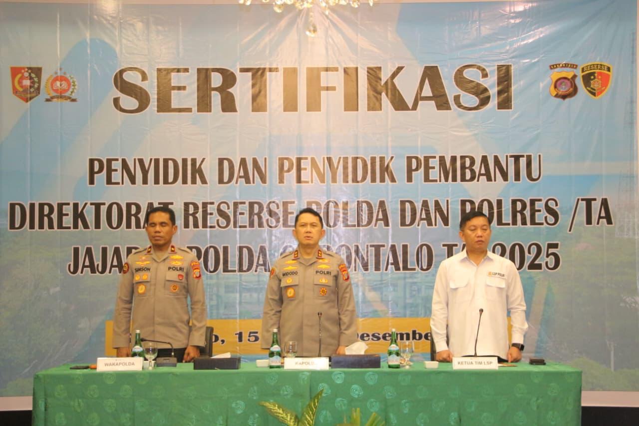 Di era penuh dengan transparansi dan kompetensi ketat ini, segala macam profesi dituntut untuk bisa mejalankan profesinya secara profesional dan terlegitimasi. Begitu pula halnya dengan tugas tugas Polri khususnya para penyidik Polri. Penyidik Polri sebagai penyidik Utama mempunyai tantangan yg berat dalam era global saat ini, penyidik tidak hanya dituntut mempunyai pengetahuan yang cukup melainkan kuga harus memenuhi standar kompetensi baik itu Integritas, effort dan keampuannya dalam menjalankan profesi penyidikan. Oleh karena itu Polda gorontalo pada hari rabu 17 desember 2025 melaksanakan sertifikasi kepada para penydik polda dan jajaran polres . Kegiatan tersebut dibuka langsung oleh kapolda gorontalo Irjen Pol Widodo SH., MH. Dalam sambutannya kapolda Gorontalo menekankan agar para peserta sertifikasi melakukan beberapa hal :