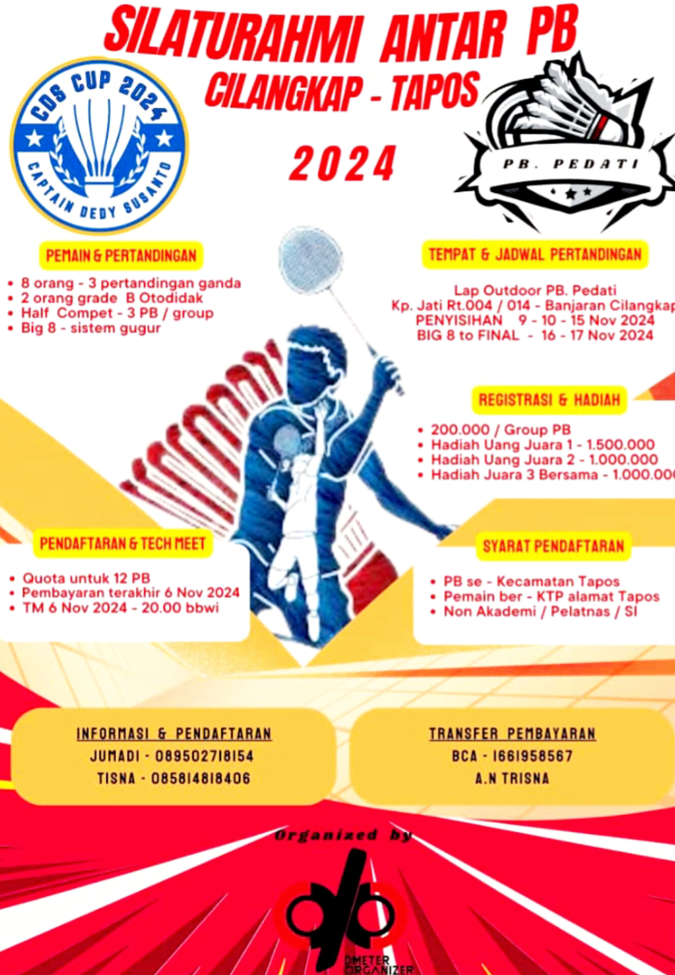 Dalam upaya meningkatkan semangat olahraga serta mempererat silaturahmi antar pebulutangkis di kawasan Cilangkap-Tapos, Captain Dedy Susanto atau yang akrab disapa CDS menggelar turnamen bulutangkis bertajuk “CDS Cup.” Kompetisi ini akan diadakan di lapangan outdoor PB Pedati, yang berlokasi di Kp Jati RT 04/RW 14, Kelurahan Cilangkap, Kecamatan Tapos, Kota Depok.