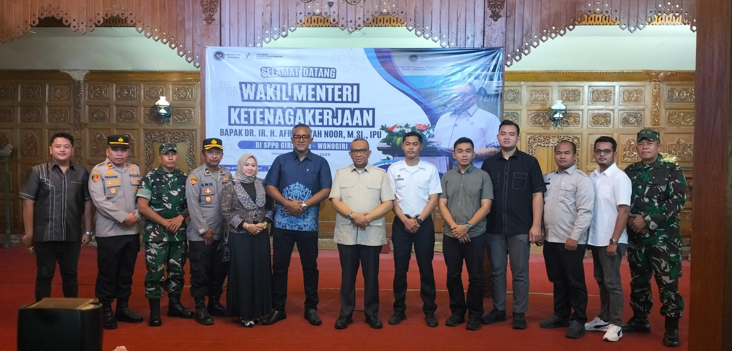 Wonogiri – Wakil Menteri Ketenagakerjaan RI Dr. Ir. H. Afriansyah Noor, M.Si., IPU melakukan kunjungan kerja ke Satuan Pelayanan Pemenuhan Gizi (SPPG) Giriwono, Yayasan Cahaya Masa Depan Nusantara, Minggu (7/12/2025). Kunjungan berlangsung pukul 13.45 WIB sampai selesai dan diikuti sekitar 80 peserta dari berbagai unsur terkait.
