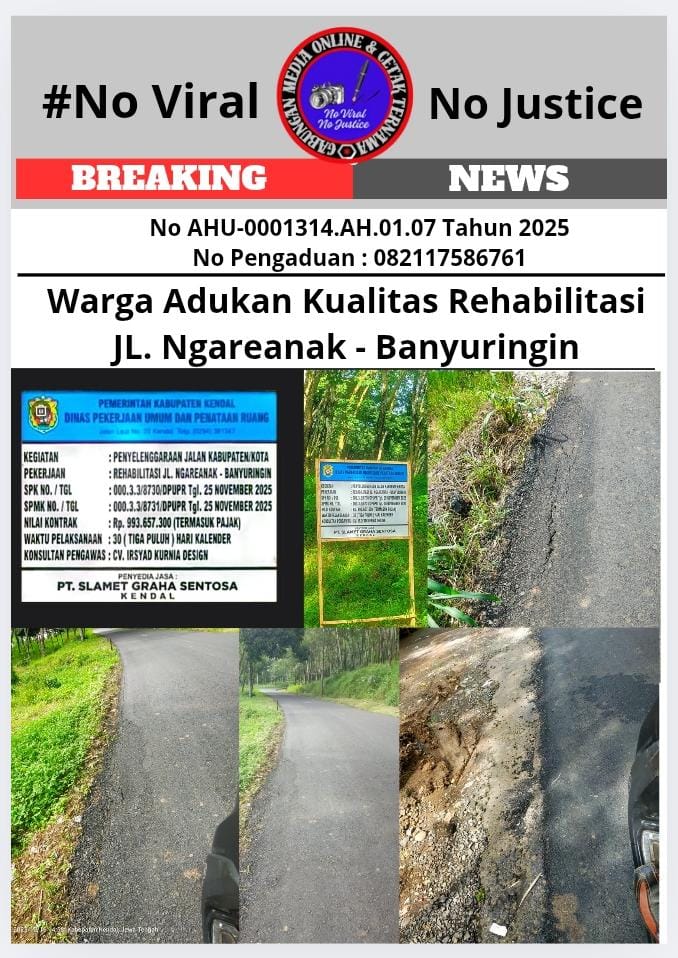 Kendal, – Pekerjaan rehabilitasi Jalan Ngareanak – Banyuringin di Kecamatan Singorojo, Kabupaten Kendal, yang dikerjakan oleh kontraktor PT Slamet Graha Sentosa Kendal dengan konsultan pengawas CV. Irsyad Kurnia Design, menjadi sorotan setelah diadukan oleh warga kepada awak media pada Selasa (16/12/2025).