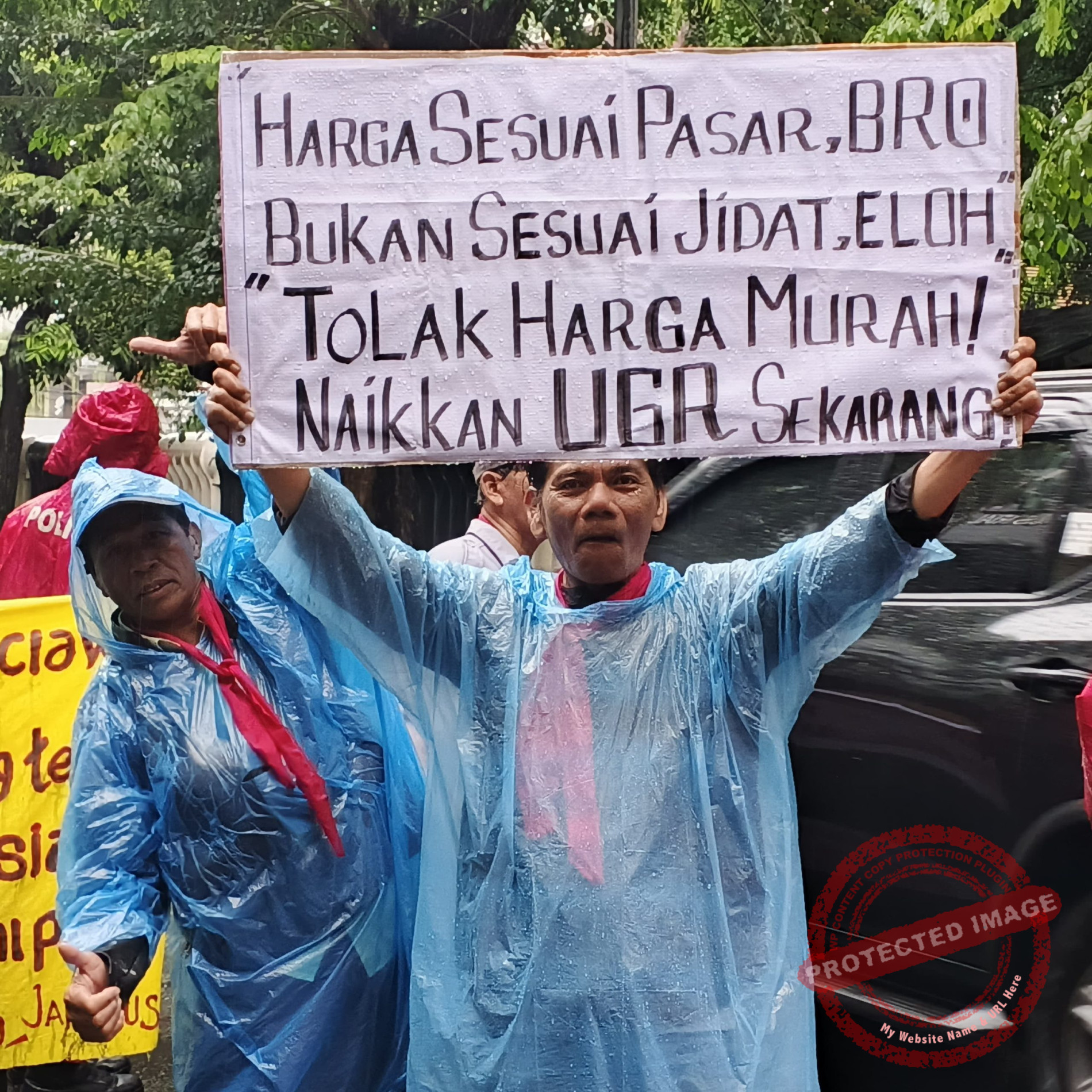 Dalam aksi yang berlangsung di tengah guyuran hujan, warga menyuarakan tuntutan mereka dengan membawa spanduk dan poster. Salah satu poster bertuliskan, “Harga sesuai pasar, bro. Bukan sesuai jidat, eloh. Tolak harga murah! Naikkan UGR sekarang!”.